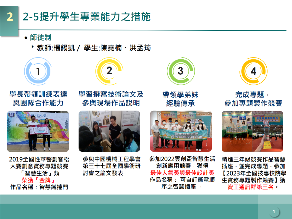 This department cultivates students' abilities mainly through appropriate course planning and design of individual course teaching content, and formulates the ability indicators that the course should achieve. In actual operation, Before the start of each semester, teachers of each subject should write a course syllabus and weekly teaching content for the entire semester, as well as the ability indicators that students need to achieve during course training, etc. It is also announced on the learning website for students’ reference before the start of the semester. Students can obtain the course syllabus and teaching content before the start of the semester. In addition, the department actively plans and integrates teaching-related software and hardware resources. Establish learning teaching assistants to assist teachers in teaching preparation and strengthen remedial learning teaching, hoping to improve and enhance students' interest in learning through the power of peers or seniors. Implement remedial teaching for basic courses and professional courses with learning difficulties.