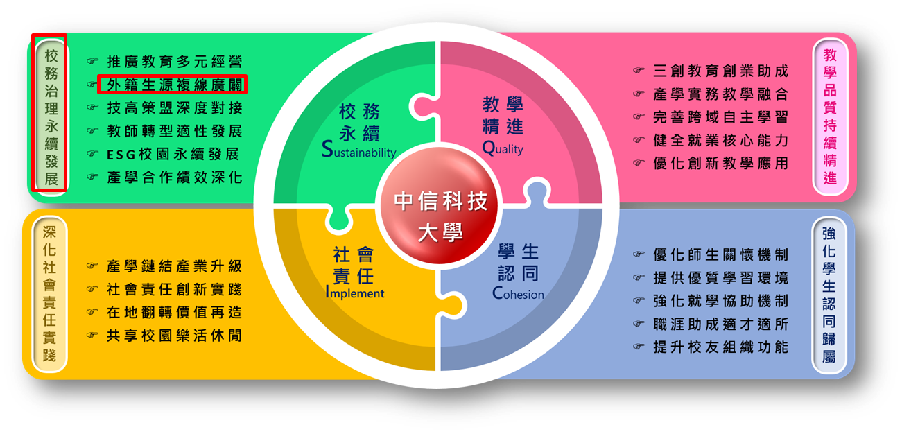 Establish a special class for foreign students’ production-study cooperation curriculum planning and combine it with a professional practical internship orientation to connect what students in the special class learn in school with enterprises, so as to create students’ competitiveness in the workplace in Taiwan or their home country.